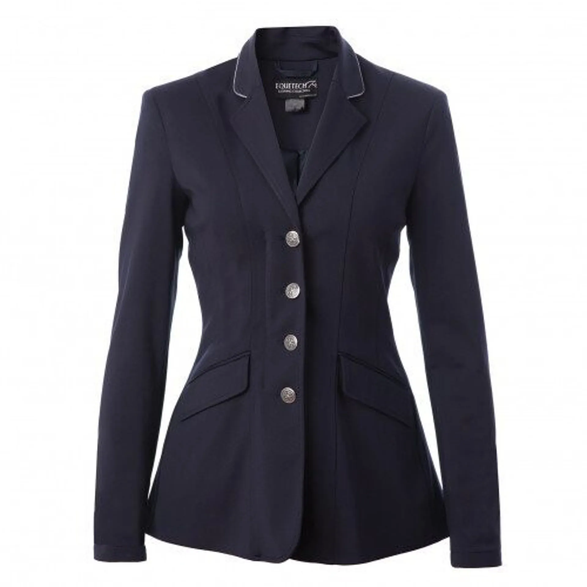 Classical tailored competition jacket with modern elements. Made from durable knitted ponte fabric with 5% Lycra added stretch and shape retention. Other features include fancy double piping to collar, Equetech exclusive crystal button, double back vents, darted contoured sleeves and concealed zip pockets. Machine washable.