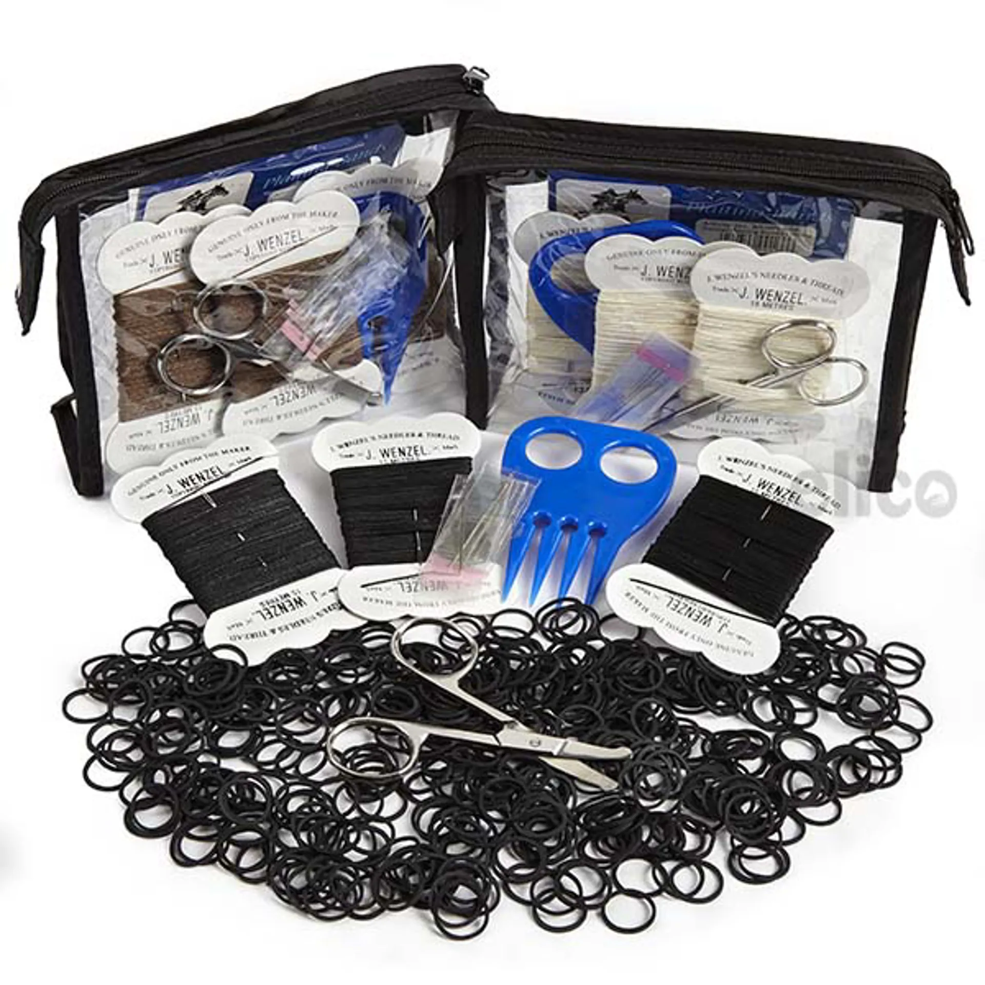 A clear PVC zip-up pouch containing the following: Plaiting Scissors, Plaiting Aid, 3 Wenzels, Pack of Plaiting Bands and 5 needles.