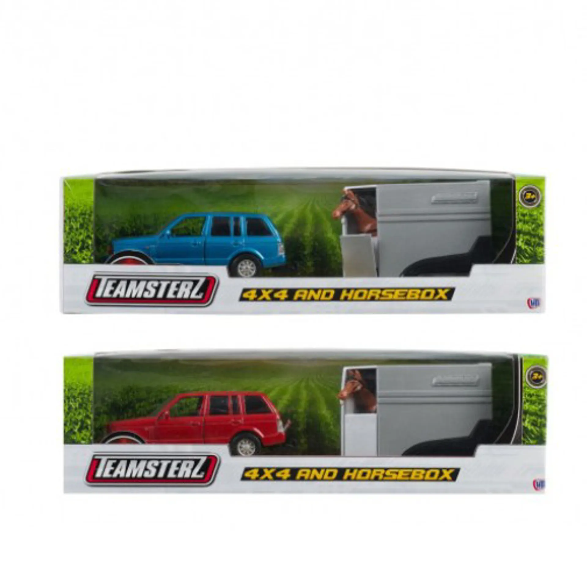 Diecast with plastic parts featuring opening doors and horse. 1:35 scale. 4×4 length approx 12cm – Trailer 10cm. From 3 years.