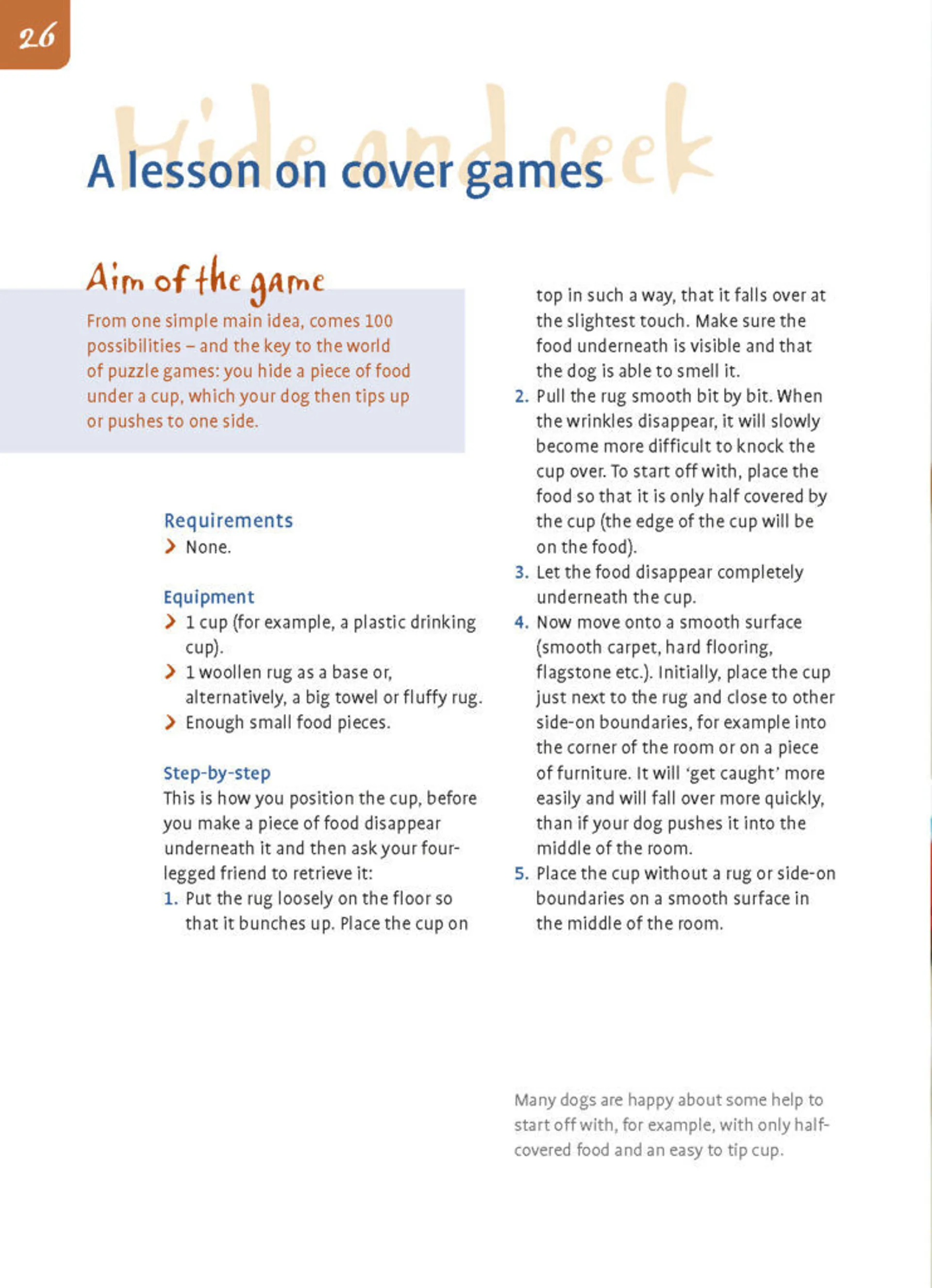 For a well behaved and happy dog, mental stimulation is as important as the daily walk. In this book you will find many creative brain teasers that you can implement quickly and easily at home and that really challenge your dog.