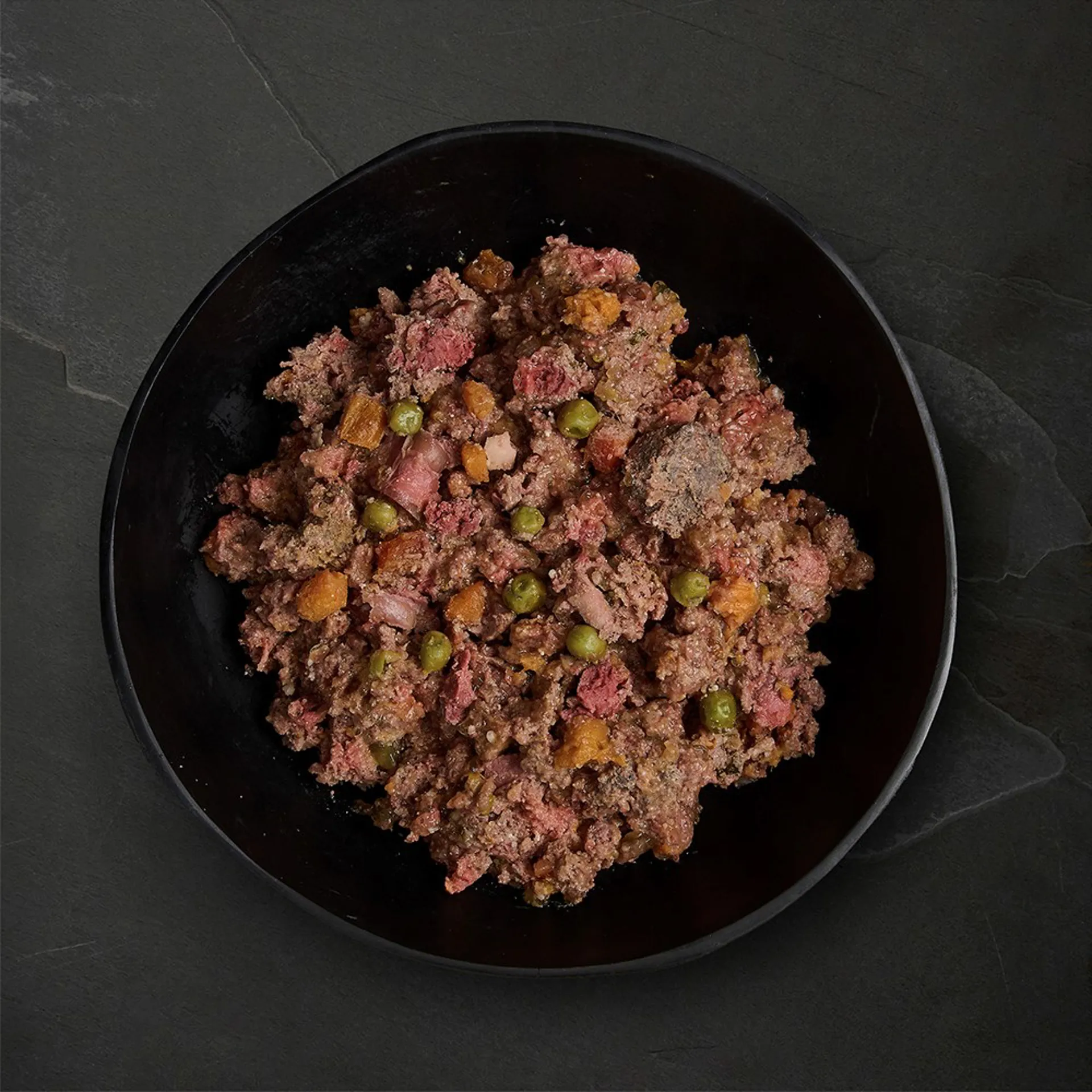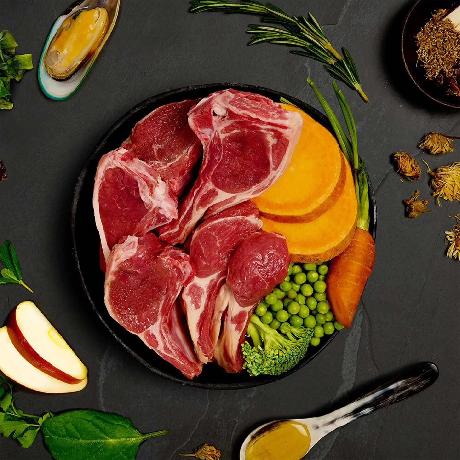 Freshly Prepared Lamb (65%), Sweet Potato, Carrots, Peas, Broccoli, Minerals, Green Lipped Mussel*, Salmon Oil, Apple, Spinach, Seaweed, Parsley, Yucca, Rosehips, Nettle, Marigold, Slippery Elm, Aniseed, Peppermint, Rosemary. *Source of Glucosamine (100 mg/kg).