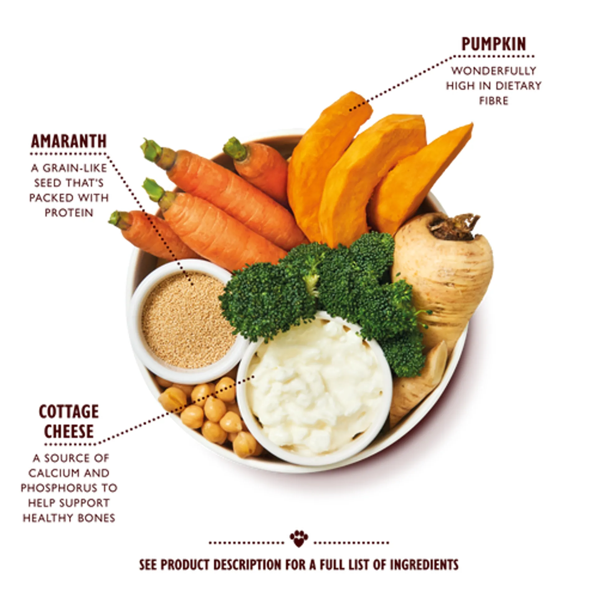 Note that over the next few months, as we move over to the new packaging, you may receive a mixture of different packs. Please bear with us!Carrots (10%), Cottage Cheese (10%), Parsnips, Whole Egg Powder, Pumpkin (6%), Broccoli, Amaranth Flakes (5%), Linseed Oil, Oat Flakes, Minerals, Apples, Beans, Chickpeas, Yeast, Lentils.