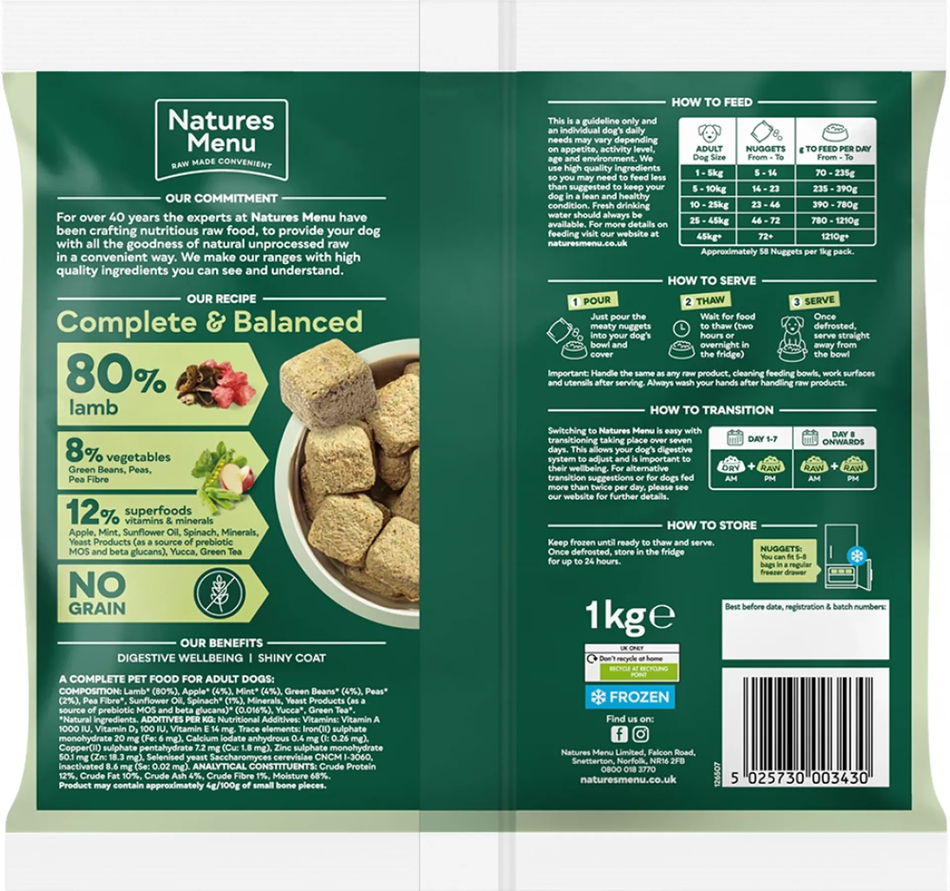 Natures Menu Complete & Balanced 80 20 raw dog food, is crafted and approved by our in house experts and made to FEDIAF guidelines, so you can feed your dog safe in the knowledge that you are giving them the highest quality natural, ingredients in every meal. Our raw nuggets are a hearty, single source of lamb for dogs, made from natural ingredients you can see, understand and trust. This is lamb dog food with a difference; we take the guesswork out of raw feeding!