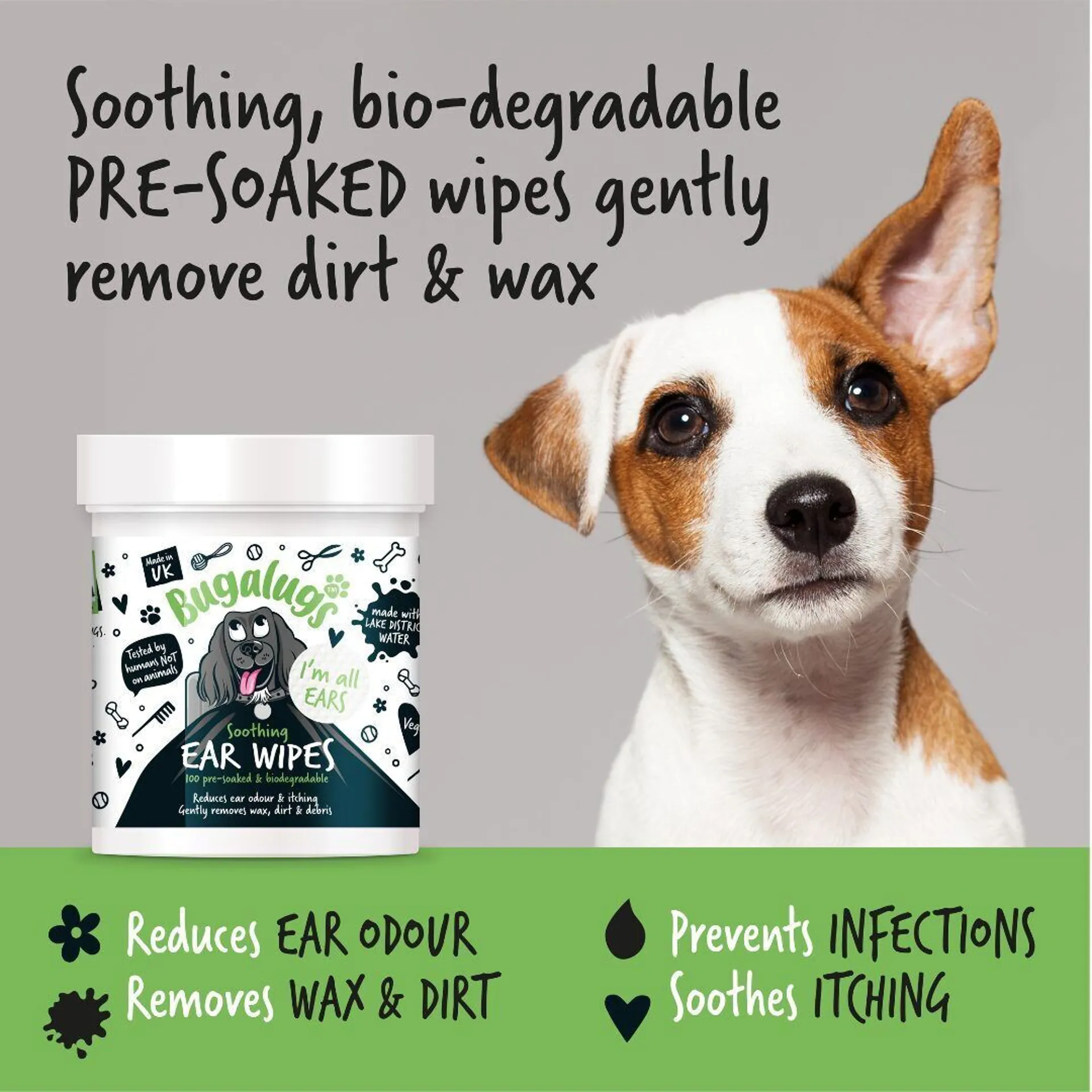Bugalugs Ear Wipes help keep your dog’s ears clean and healthy by gently and effectively wiping away dirt and wax with our natural formula. The pre-soaked wipes are 100% bio-degradable and are safe to use as part of your daily routine to help relieve itching and promoting ear health.