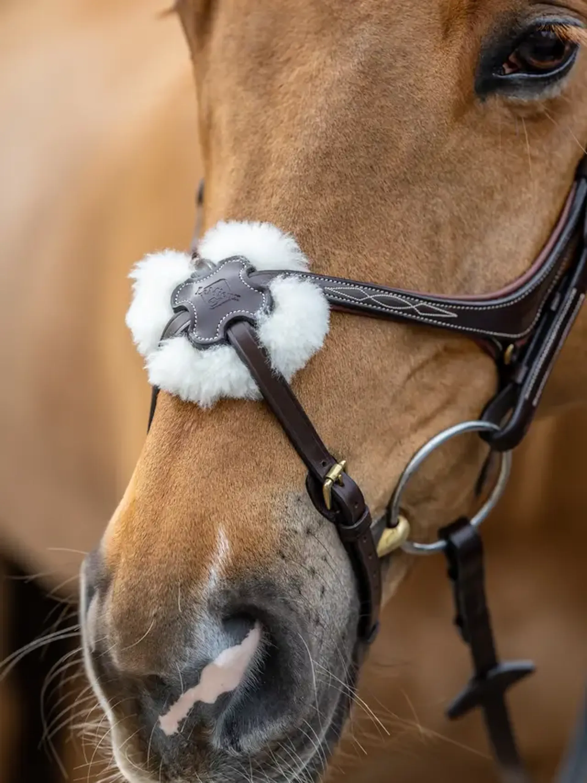It comes with interchangeable padding at the back of the nosepiece with the option of merino wool or a soft leather cushion. A featured D-ring on noseband allows the pieces to sit smoothly against the horse's cheeks and jaw. This helps to provide a tailored fit for different jaw shapes and the back strap can move independently.