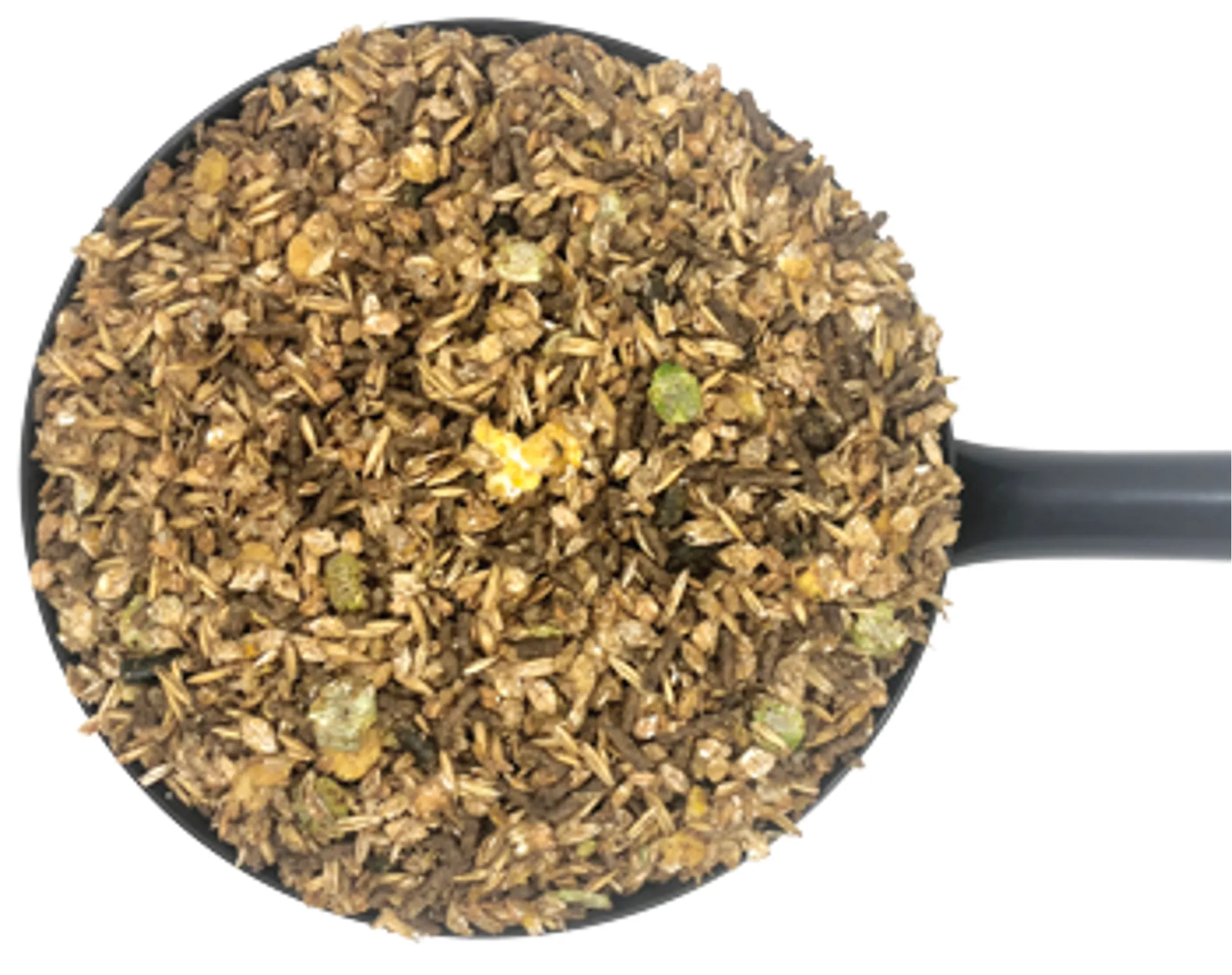 Oats, Flaked Barley, Wheatfeed, Flaked Wheat, Sunflower Seed Meal, Dehulled, Grass Meal, Molasses, Flaked Soya, Soya Ext, Micro Flaked Maize, Full Fat Linseed Meal, Linseed Expeller, Calcium Carbonate, Micro Flaked Peas, Dicalcium Phosphate, Dried Beet Pulp, Full Fat Soya, Sodium Chloride, Magnesium Oxide, Rapeseed Oil, Fructo-oligosaccharides, Mannan oligosaccharides, Basil, Mint, Soya Oil (produced from GM soya)