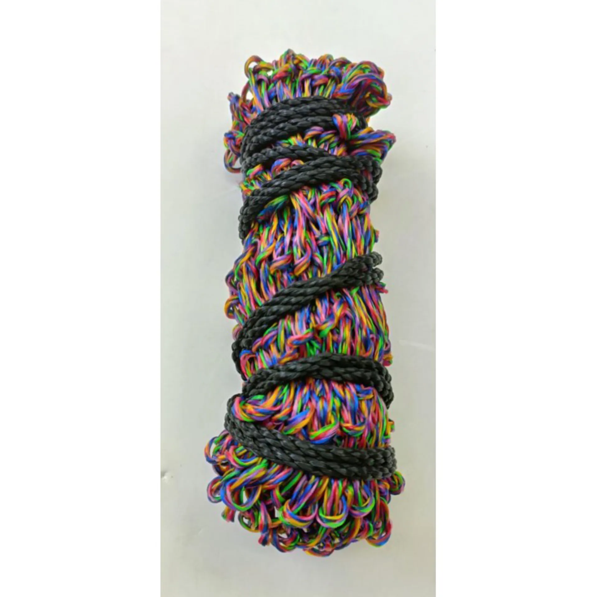 We have managed to get this compact wrapped which is a new method, when unravelled the compressed material springs out and is super stretchy. With thick tie cord this bright new product will fly off the shelves.